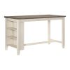 The multifunctional design of the Timbre Collection will be the perfect addition to your dining nook. A built-in bookcase provides open display space to this counter height offering. Wire brushed acacia veneer is highlighted by a whitewash finish. Brown fabric seats top the accompanying stools and feature nailhead accent for added decorative flair.PRODUCT DIMENSIONS: TABLE: 30" x 60" x 36.5"HApron to floor: 32.5"Shelf interior: 22.5" x 7" x 8.5" (3)STOOL: 22" x 17" x 24.5"HSeat Width: 18.5"Seat Depth: 14"Seat Height: 24.5"Listing Includes: 5pc Dining Set (Counter Height Tabe and 4 Counter Height Stools) Only.Simple Assembly Require.