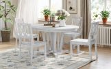 [5-piece Dining Table Set] This 5-piece dining table set exudes elegance with its round tabletop and distinctive trestle-based legs, creating a refined and inviting atmosphere. The graceful gray wood texture adorns both the tabletop and four cross-back dining chairs, making it a perfect fit for farmhouse or modern-style dining rooms. Additionally, the extendable table adds versatility, ensuring suitability for any room size. Experience sophistication and comfort with this versatile dining set